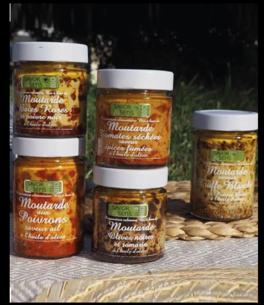 Les moutardes Savor & Sens allient créativité et savoir-faire provençal. Élaborées avec des ingrédients naturels, elles se déclinent en saveurs originales — truffe, figue, pistou, citron, cassis, ou estragon — pour sublimer vos viandes, poissons et recettes du quotidien avec une touche colorée et raffinée.